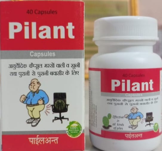 • Pilant Capsule  is an ayurvedic formulation which combats piles (hemorrhoids). It majorly contains Lodhra,Kaharva pisti, ,Yashad bhasma and many formulation. Pilant Capsule shrinks pile mass, controls bleeding and heals inflamed skin and the mucus membrane. The drug offers symptomatic relief from rectal bleeding, pain, itchiness and corrects chronic constipation associated with hemorrhoids. The local analgesic property of Pilant Capsule relieves pain and ensures pain-free fecal excretion. Pilant Capsule also acts as an antimicrobial and prevents secondary microbial infections in the body..